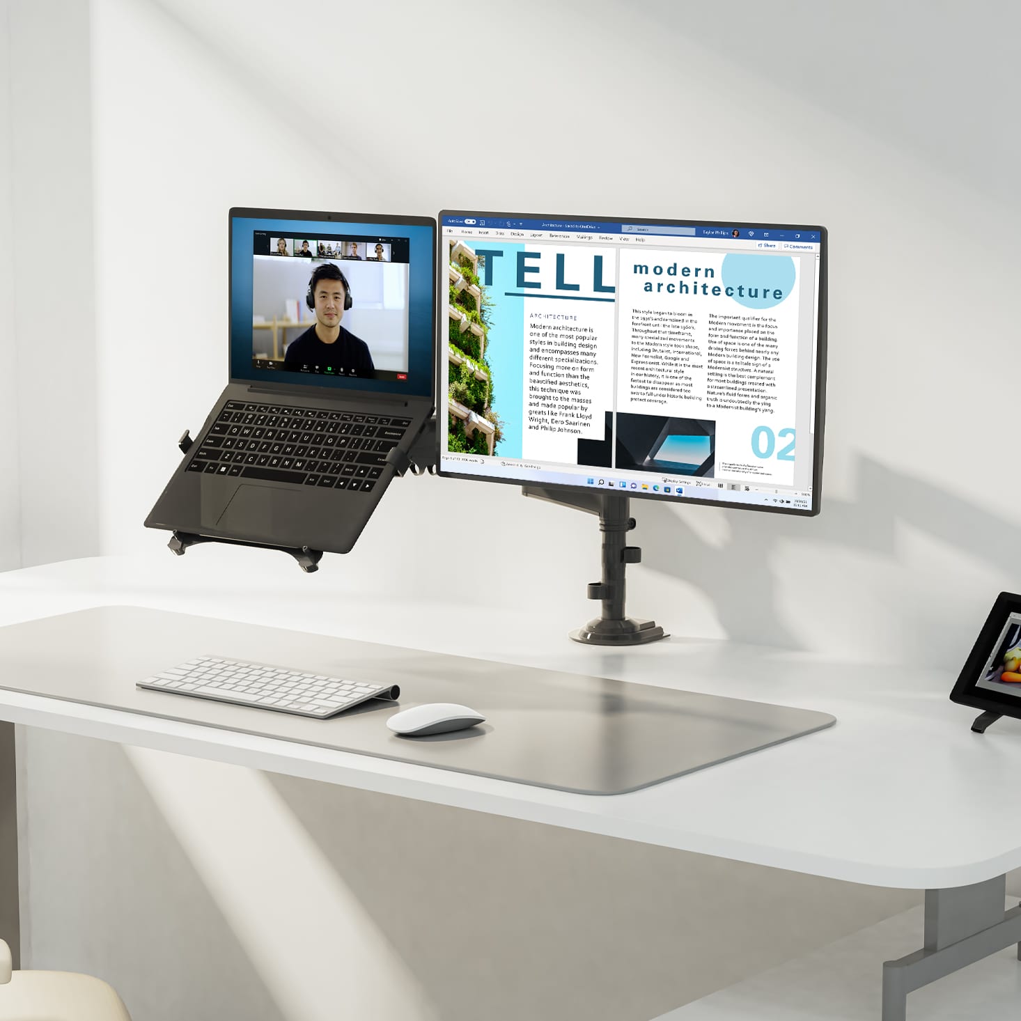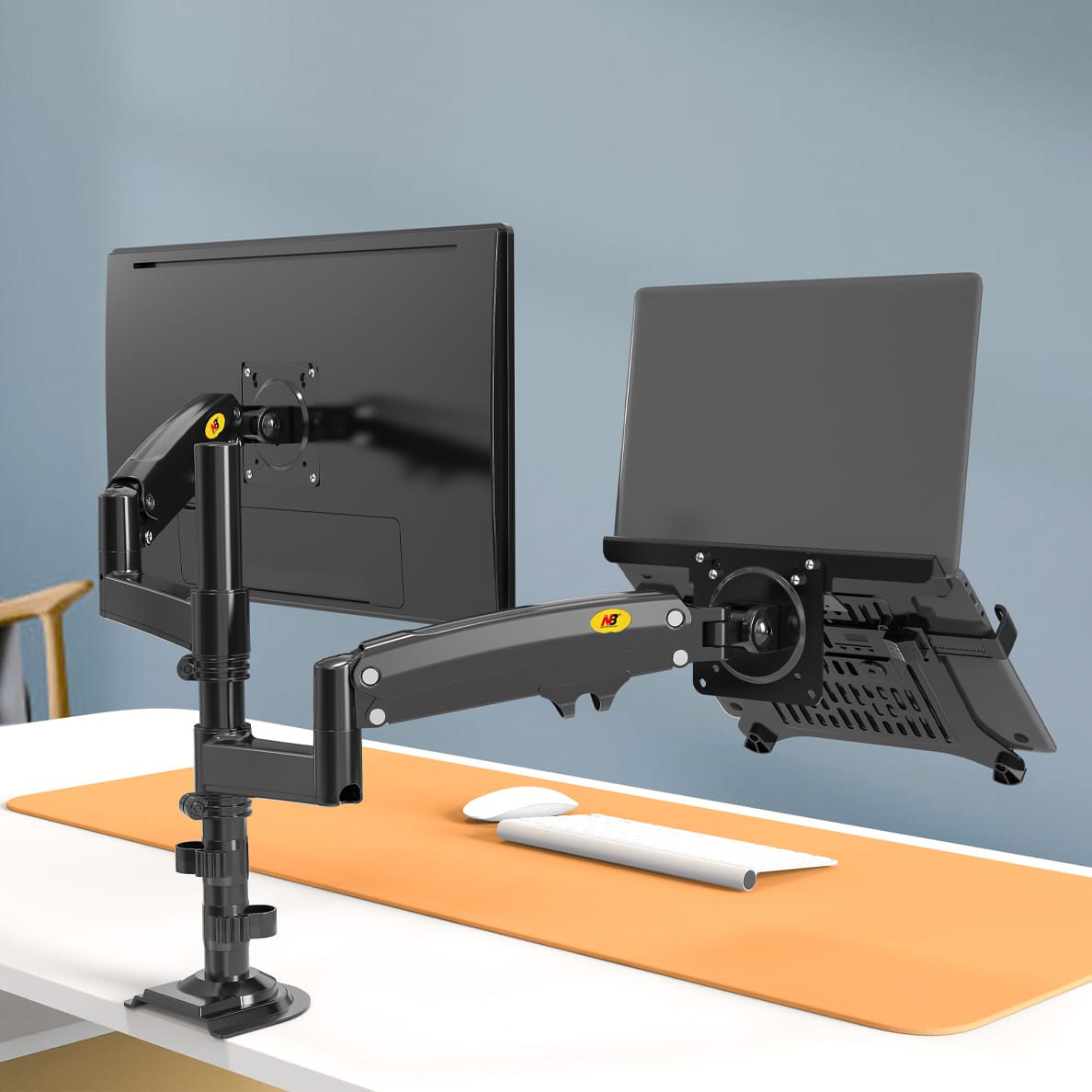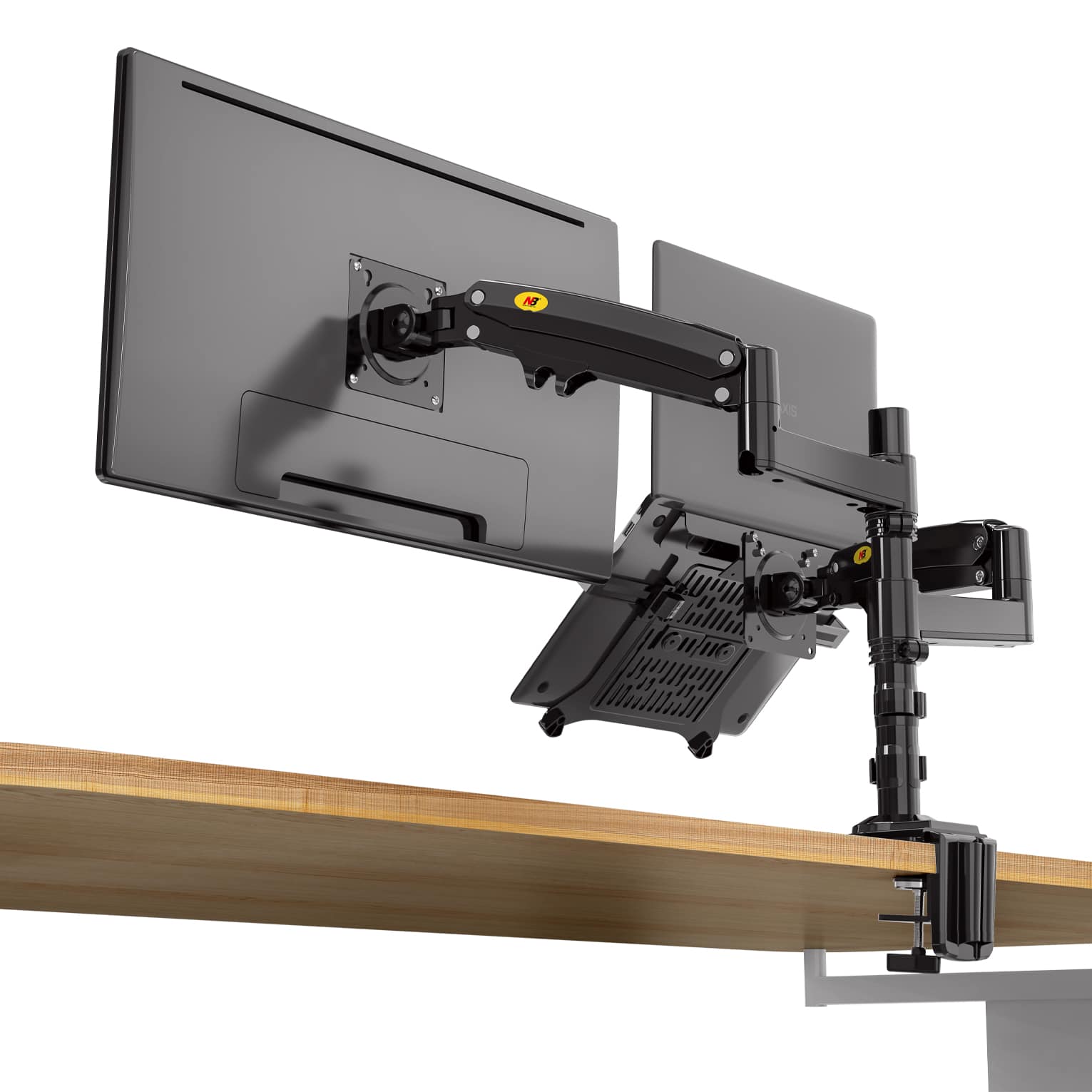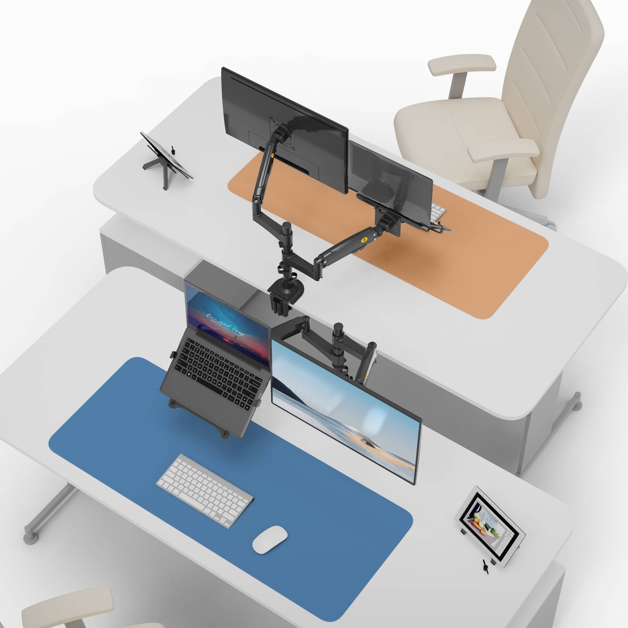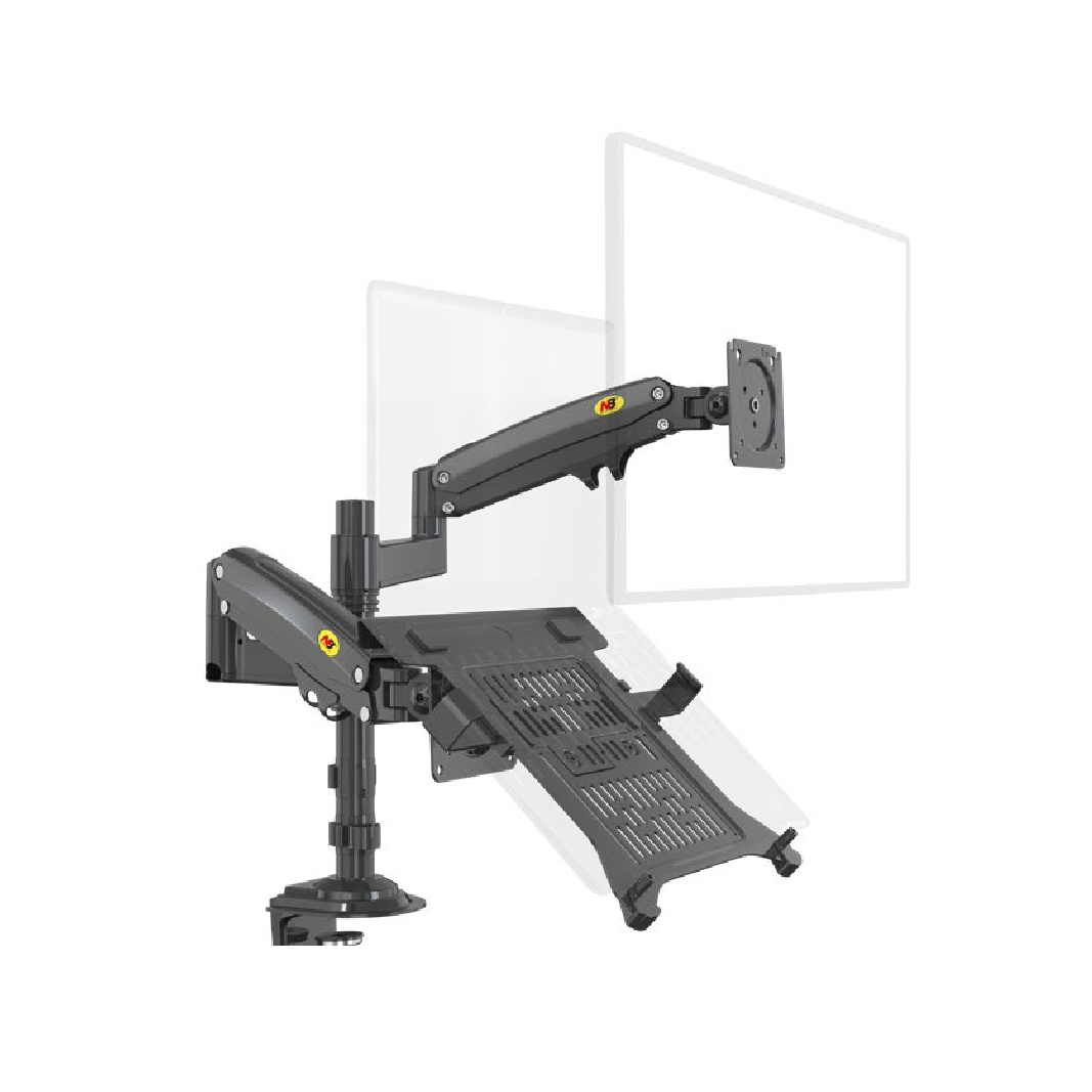 Dual Monitor Desk Stand with laptop tray, 17″-27″, Tablet 10″-17″, Max 9kg, Upright, Swivel/Tilt angles, Rotation 360°, Vesa 75×75-100×100mm