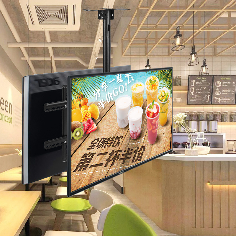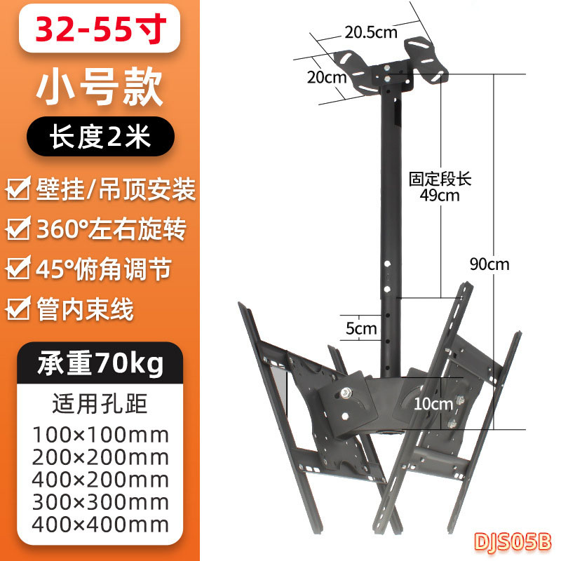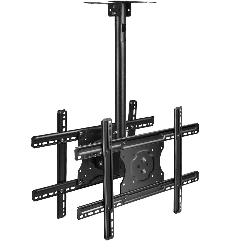 TV Ceiling Mount Back to Back, designed for 32″-55″ screens, supports up to 70kg. Offers -45° to +45° tilt and full 360° rotation for optimal viewing. Compatible with VESA 100×100 to 400x400mm. Perfect for dual-screen commercial or home setups.